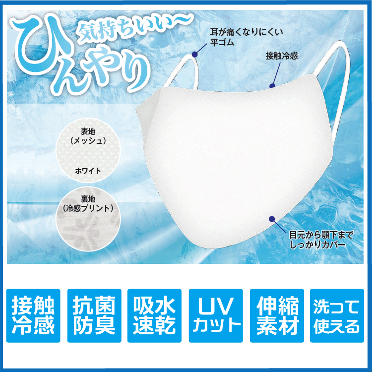 カラー:白 素材 表地(メッシュ):ポリエステル100%裏地(冷感プリント):ナイロン79% ポリウレタン21% 製造 生地・冷感プリント・縫製・仕上 すべて日本製 その他 ※商品は1枚ずつの個包装となります。